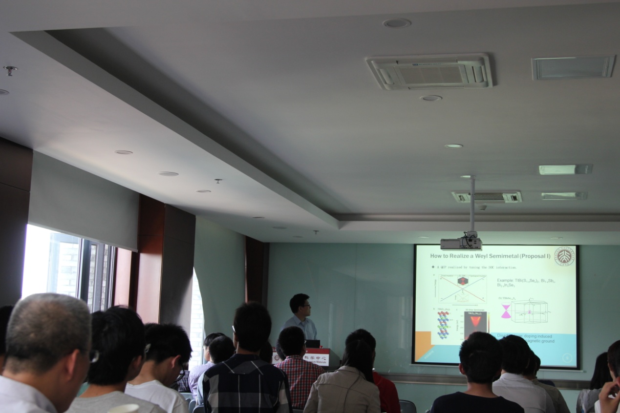 本次学术活动以当前学术前沿热点3D Topological Dirac and Weyl Semimatals为主题。新型量子及拓扑态研究创新平台成员贾爽及翁红明分别作了题为“Transport properties of recent discovered Weyl semimetals”及“Discovery of Weyl semimetal in TaAs family”的报告。专题报告结束后,各平台成员进行了自由讨论。
