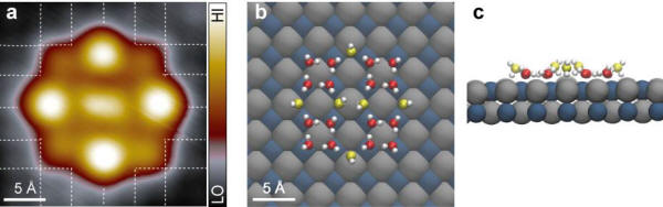 图a:由四个四元环和六个“桥联”水分子形成的二维冰团簇的高分辨STM图像,图中的网格线为NaCl(001)衬底 的Cl-晶格。图b和图c:由第一性原理计算得到的冰团簇原子结构的顶视图和侧视图。位于冰团簇中间的两个“桥 联”水分子形成一个Bjerrum D-type缺陷。在高覆盖度下,这种冰团簇可作为形核中心进一步生长为二维的冰层。 |