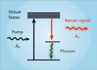 该研究的最重要的创新点是直接在二氧化硅芯片上制作了微型拉曼激光器,不再需要像从前的研究中事先对芯片进行稀土离子掺杂。此前所采用的额外添加物的研究方法有如下缺点。首先掺杂额外的添加物会使得器件的制作过程变得复杂和增加成本,而且还会降低传感器的生物兼容性。另外,使用稀土离子产生光学增益需要特定波长的泵浦光来匹配稀土离子的跃迁能级,所以对于不同的稀土离子,必须用不同波长的泵浦光源。该研究中使用的拉曼效应如图2所示。由于拉曼增益可以利用任意波段的泵浦光,很大程度上解决了对于特定泵浦光源的苛刻要求。这使得我们可以在不同环境中使用同一个无掺杂的传感器,根据特定的环境选择合适的工作波长,比如选择该环境中吸收最小的波长,或者根据目标纳米粒子的特性选择合适的泵浦波长。