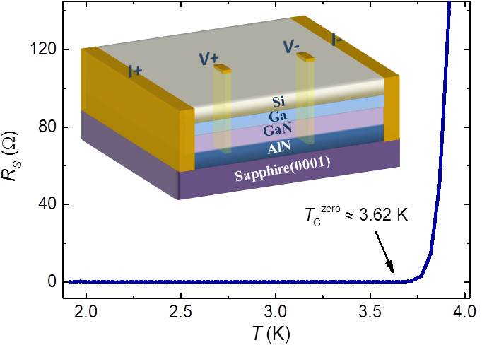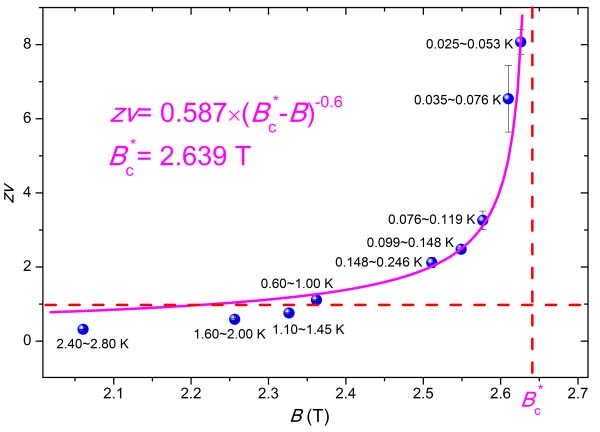 图:三个原子层厚的镓薄膜超导与临界指数在靠近量子相变点(绝对零度)时的发散行为。 |