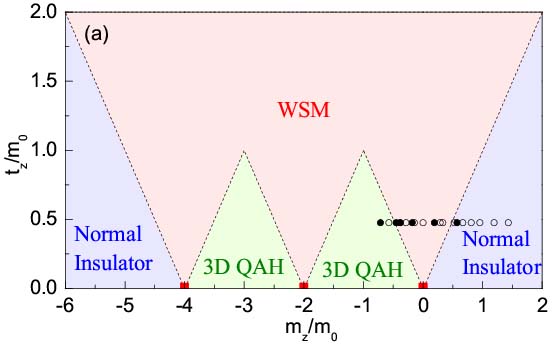 最近,陈垂针等人利用精确数值结合理论解析方法系统地研究了无能隙Weyl点和费米弧的对杂质势散射的稳定性。在此基础上,获得了无序引起的Weyl半金属中新奇量子相变物理图像。他们意外发现, 考虑Weyl点成对出现这一特性时, Weyl半金属体系存在异常丰富的相图 [见图b]。特别是,该相图中存在三个难以被传统理论理解的新奇相变: (1)Weyl半金属到三维量子反常霍尔绝缘体的相变;(2)Weyl半金属到三维反常霍尔金属的相变;(iii)普通绝缘体到Weyl半金属的相变。他们得到了无序引发这些相变的物理机制并探讨了在光子晶体中观测到这些相变的可能性。