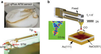 图1:(a) qPlus型原子力传感器的实验装置图;(b) 具有电四极矩电荷分布的一氧化碳针尖与强极性水分子之间的高阶静电力。 |