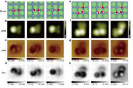图2:各种亚稳态的水二聚体(a-d)和三聚体(e-h)的亚分子级分辨成像。AFM图中弯曲的暗环来源于水分子氢原子的静电势分布,据此可以确定氢原子的取向。 |