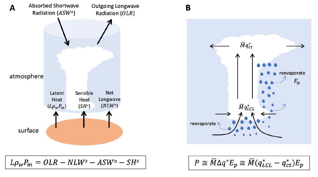图2.全球平均降水的能量约束(A)和动力约束(B)示意图。 在能量约束下,全球平均降水强度由大气净能量损失决定。在动力约束下,全球平均降水强度主要由对流质量通量、云底和云顶之间的水汽绝对湿度差以及降水效率决定。