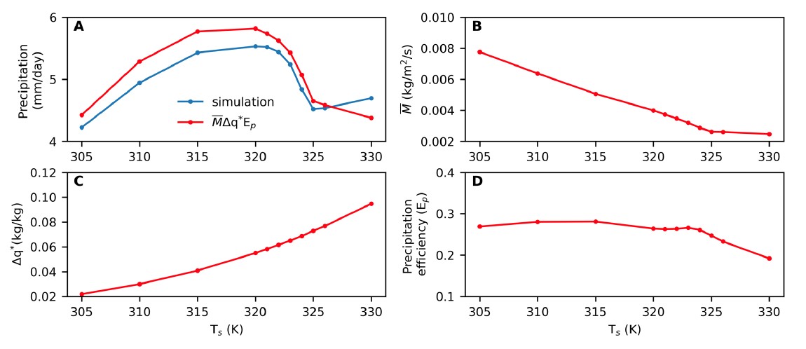 图4.全球平均降水量的动力约束。(A)模式模拟的平均降水(蓝线)和基于动力约束的估计平均降水(红线)随地表温度的变化。(B)垂直平均的对流质量通量随地表温度的变化。(C)云底与云顶的水汽绝对湿度差随地表温度的变化。(D)降水效率随地表温度的变化。极热气候下平均降水量减弱主要是由于对流质量通量的减少。