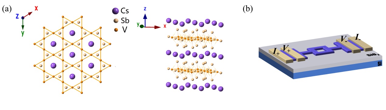 图1.(a)笼目超导体CsV3Sb5晶体结构示意图。(b)笼目超导体CsV3Sb5环形器件示意图。