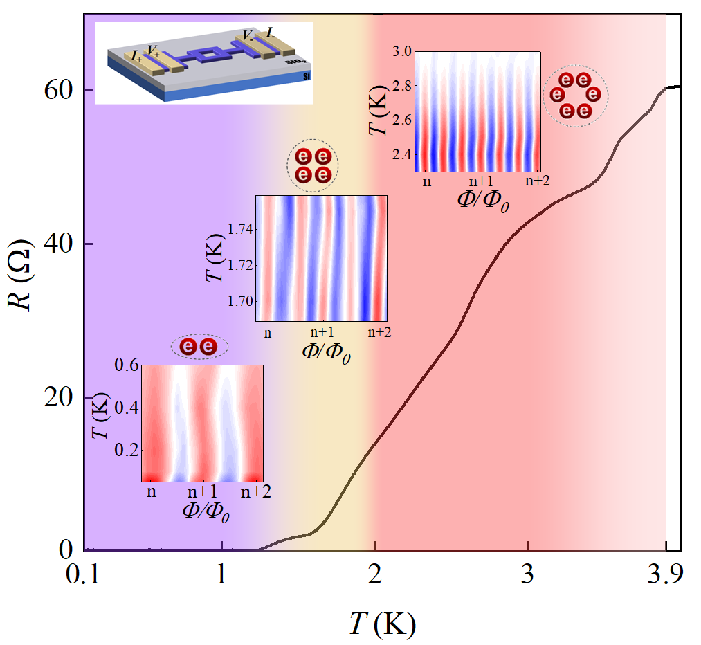 超导是一种极其重要的宏观量子物态,具有零电阻、抗磁性、双电子量子化磁通(h/2e)等特性,自1911年发现以来得到了学术界和工业界的广泛关注。无论是对于常规超导(BCS超导体)还是非常规超导(铜基、铁基高温超导体,拓扑超导体等),当前对于超导的认知都是建立在双电子(费米子)配对的图像(超导库珀对)之上。超导态是否可以由超越两个费米子的多电子凝聚构成,是物理学界核心研究课题之一,相关研究不仅对于超导认知具有极其重要的科学意义,也有望为多费米子态的研究,例如核物理中双质子和双中子构成的α粒子凝聚以及高能物理里的多夸克态等,提供新的视角。然而,尽管前期有不少关于多电子超导凝聚态的理论工作,多电子超导一直未被实验发现。