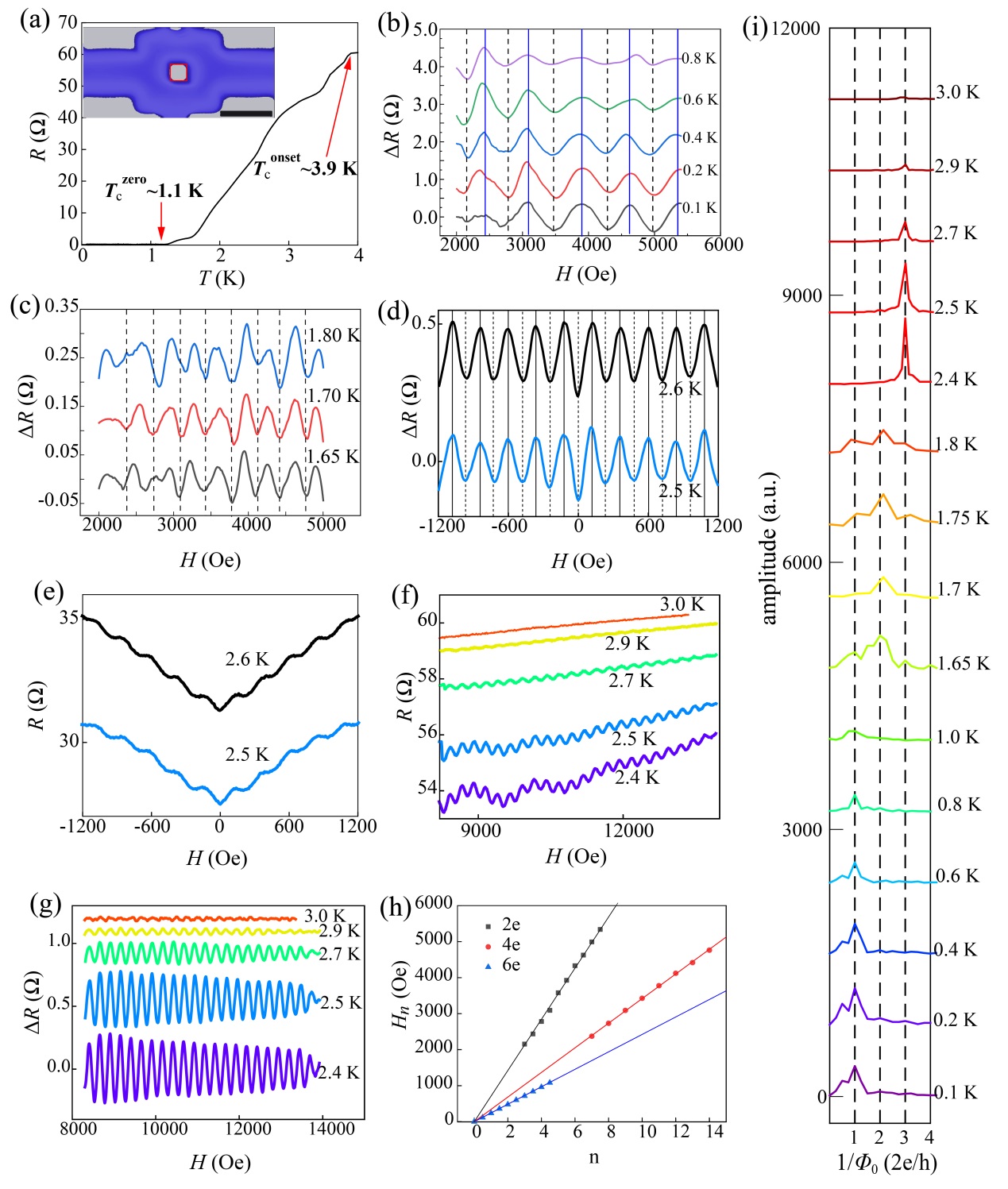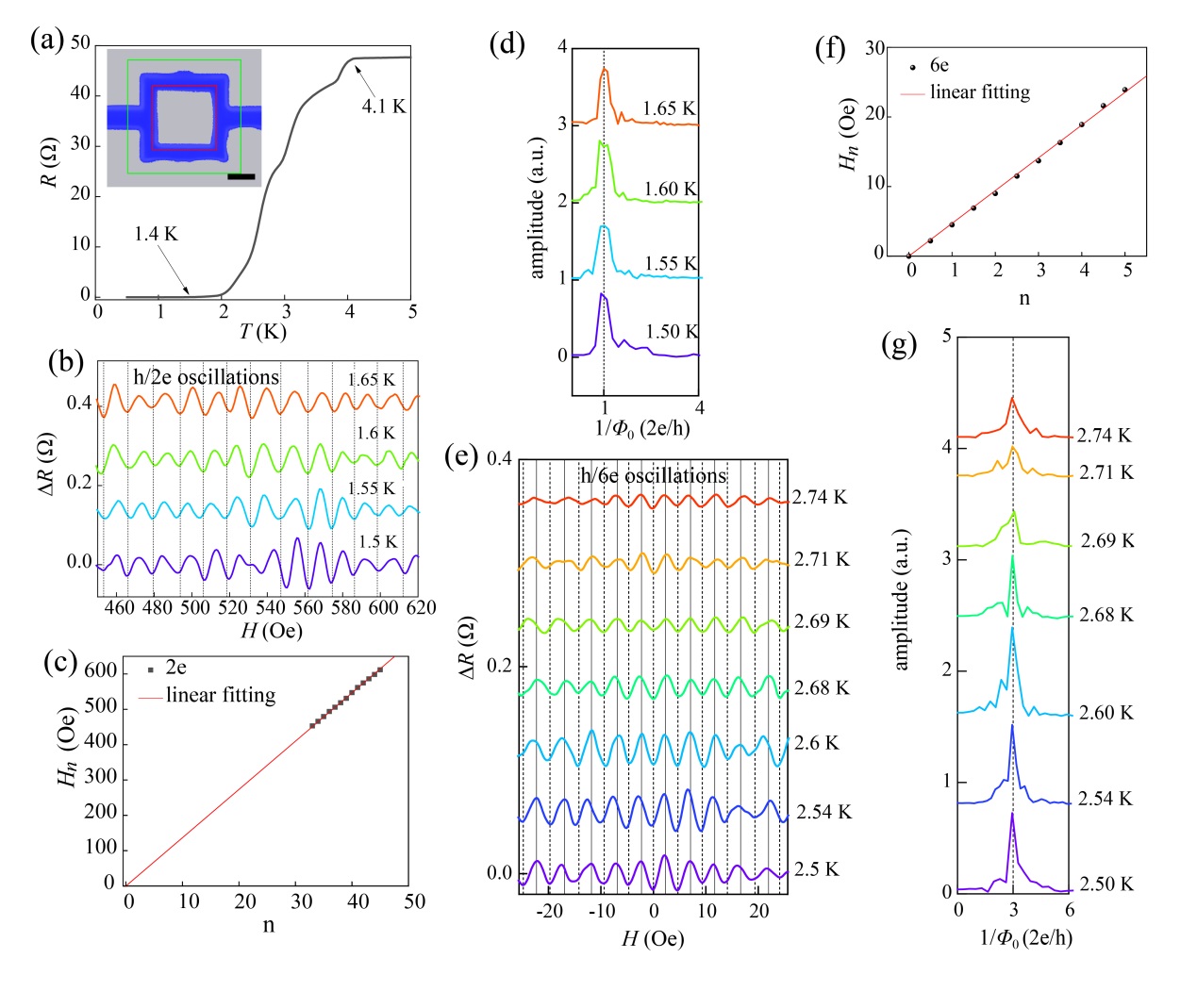图2. (a) 较小尺寸CsV3Sb5环形超导器件(环内径约为164纳米)电阻-温度曲线。插图为覆盖有保护层的环形器件的着色电子扫描显微镜图,图中红色方框为该器件中h/2e、h/4e、h/6e振荡的有效面积。(b) 扣除平滑磁阻背底后的h/2e振荡。(c) 扣除平滑磁阻背底后的h/4e振荡。 (d) 扣除平滑磁阻背底后低磁场区域的h/6e振荡。 (e) 低磁场区域的h/6e振荡原始磁阻曲线。(f) 高磁场区域的h/6e振荡原始磁阻曲线(仍处于超导转变区间)。(g) 扣除平滑磁阻背底后高磁场区域的h/6e振荡。(h) h/2e,h/4e与h/6e振荡的n-Hn线性拟合,其中n为整数或半整数,整数代表对应振荡的谷,半整数代表对应振荡的峰,Hn则代表谷(峰)对应的磁场值。(g) h/2e,h/4e与h/6e振荡的FFT结果。