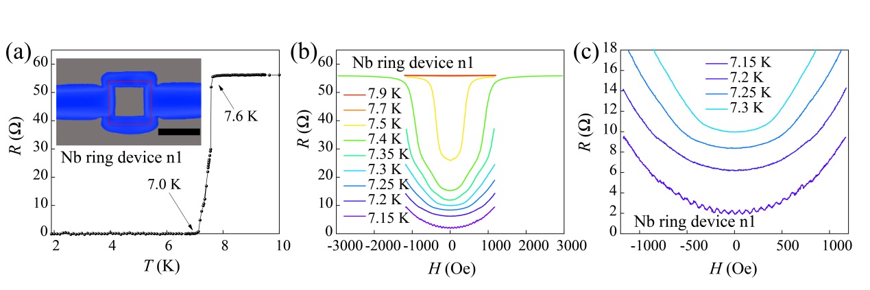 图5.(a)常规超导体铌环形器件器件电阻-温度曲线。插图为覆盖有保护层的铌环形器件的着色电子扫描显微镜图,图中红色方框为该器件中h/2e振荡的有效面积。(b), (c) 铌环形器件中的h/2e振荡。