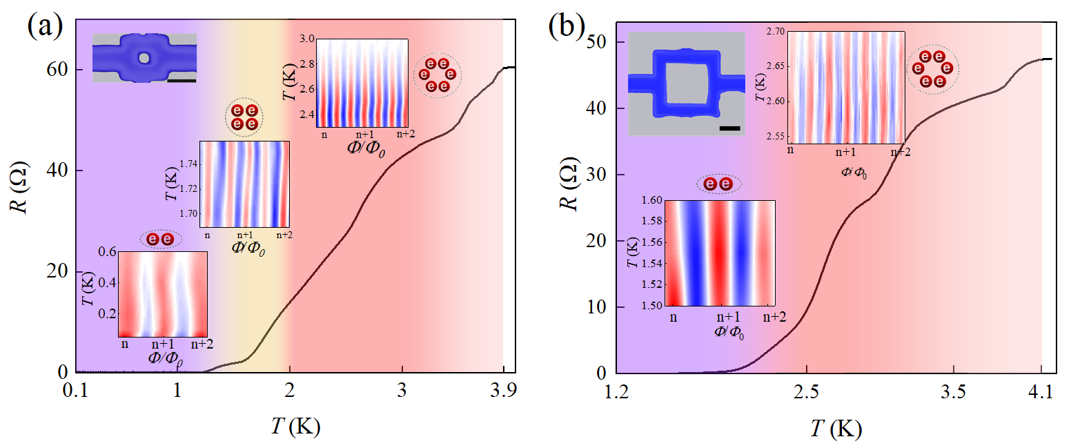 图4. (a)较小尺寸(环内径约为164纳米)CsV3Sb5环形器件中,随着温度升高,发生了由h/2e到h/4e再到h/6e的量子化磁通的变化。(b)在大尺寸(环内径约为1微米)器件中,随着温度升高,量子化磁通由h/2e直接演变到h/6e。