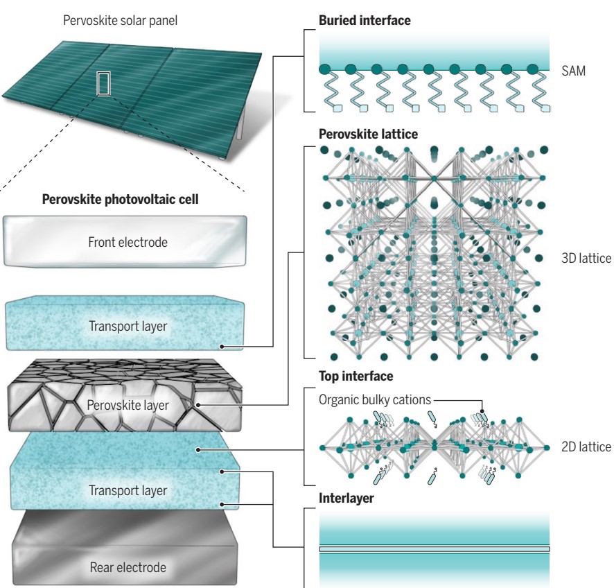 团队基于多年来对钙钛矿太阳能电池界面的深入研究与系统认知,以“解锁光伏电池界面”为主题,对钙钛矿太阳能电池的界面进行了总结探讨与前瞻分析(图2)。从经典电池结构切入,重点讨论多层薄膜界面能量损失的来源,归纳总结界面材料、缺陷、能级等性质对电池性能的影响规律,回顾经典的界面材料匹配与钝化策略。
