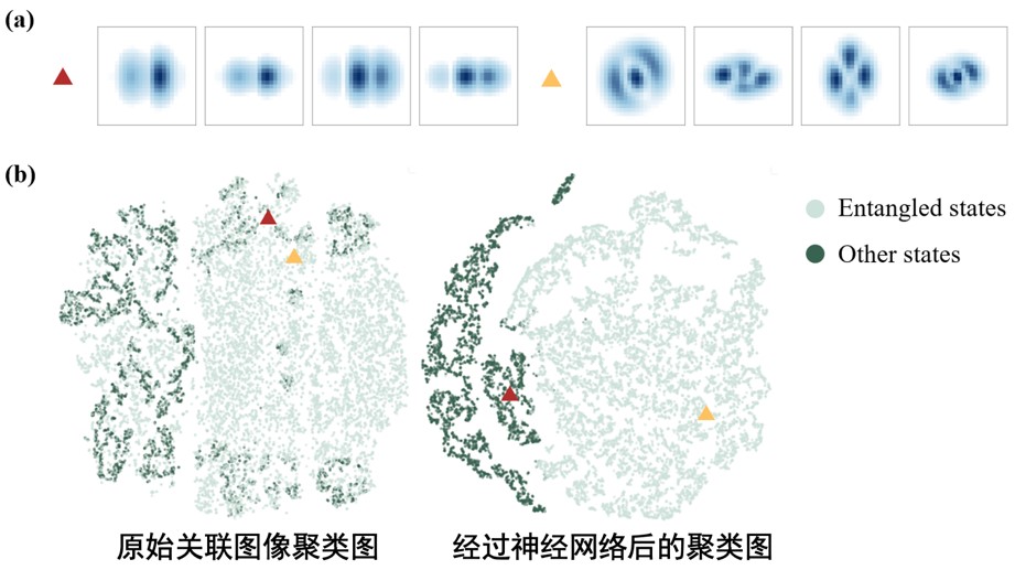 图2. (a) 降维前的两组双模量子态的关联图像。每个量子态有四幅图,降维处理后,四幅图被整合并映射成了图(b)可视化空间中的一个点;(b) 15000组双模量子态关联图像经过数据降维后的聚类图像,其中浅绿色点代表纠缠态的关联图像,深绿色点代表非纠缠态的关联图像,散点距离越近即关联图像的相似程度越高。左:未经过神经网络的原始关联图像聚类;右:经过神经网络之后,关联图像的聚类。