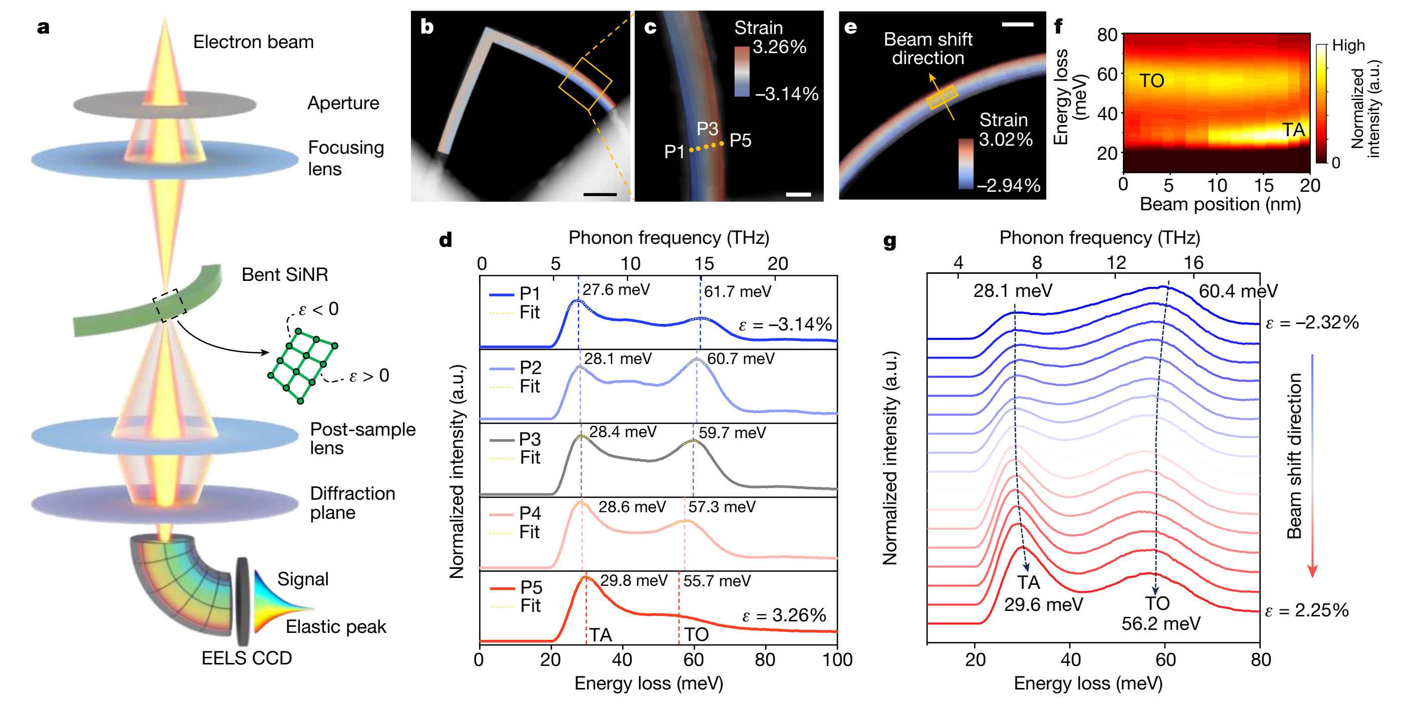 图1. 非均匀应变单晶硅纳米带声子结构的纳米尺度测量。(a)扫描透射电镜的电子能量损失谱(STEM-EELS)光路示意图。(b-c)带有扭结的弯曲硅纳米带的STEM图像和EELS测量区域的放大STEM图像;(d)沿应变梯度不同位置(P1 ~ P5)的横向声学(TA)和横向光学(TO)声子模式的EELS谱图,其中横向声学模式表现出约2.2 meV的蓝移,而横向光学模式表现出约6.0 meV的红移。弹性应变取值范围为−3.14% ~ 3.26%。通过高斯拟合提取峰值位置。(e)无扭结弯曲硅纳米带的STEM图像。黄色矩形表示EELS信号采集区域,通过将三维数据集的每个列谱沿轴向(垂直于应变梯度)求和来提高信噪比。(f)横向声模和横向光模沿电子束移位方向的振动谱图。(g)图e中标记区域沿应变梯度的EELS谱线。
