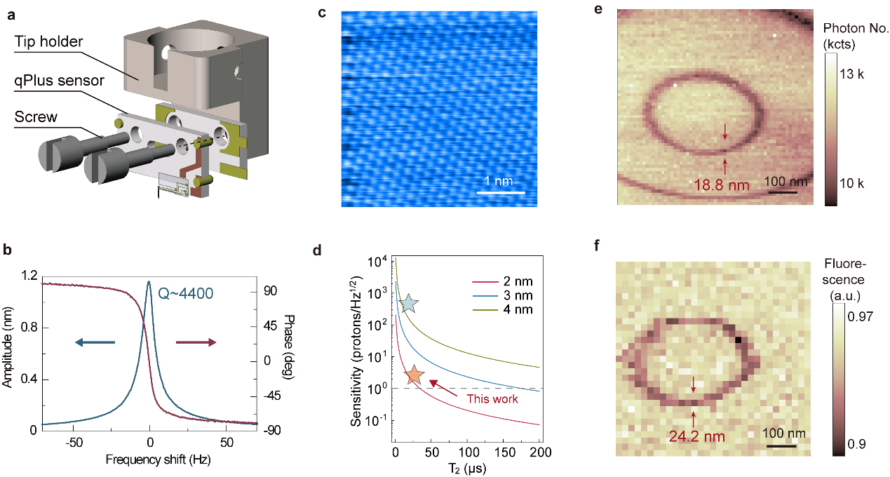 图2 (a):自主研发的新型qPlus原子力传感器。(b):新型qPlus传感器的品质因子测试。(c): STM模式下的HOPG表面成像结果。(d):基于qPlus针尖操纵后NV的探测灵敏度逼近单个质子。(e):利用浅层NV对磁性针尖的扫描磁场成像。(f):利用浅层NV对导电针尖的扫描电场成像。