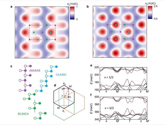 图3(a-b)电子在莫尔填充数ν=1/2和ν=3/2的实空间分布图。(c)顺序三次双层转角石墨烯不同堆叠位置的堆叠方式示意图。(d)Hartree-Fock投影路径示意图。(e-f)通过Hartree-Fock计算得到的莫尔填充数ν=1/2和ν=3/2的能带图。