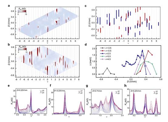 在该工作中,研究团队对器件进行了低温电输运的测量。通过对器件施加顶栅电压和底栅电压,样品表现出了一系列强的绝缘态(图1f-g)。通过量子霍尔效应对两栅极的电容进行标定后,研究团队将电阻通以莫尔填充数ν和垂直方向的电位移电场D展示出来(图2a)。