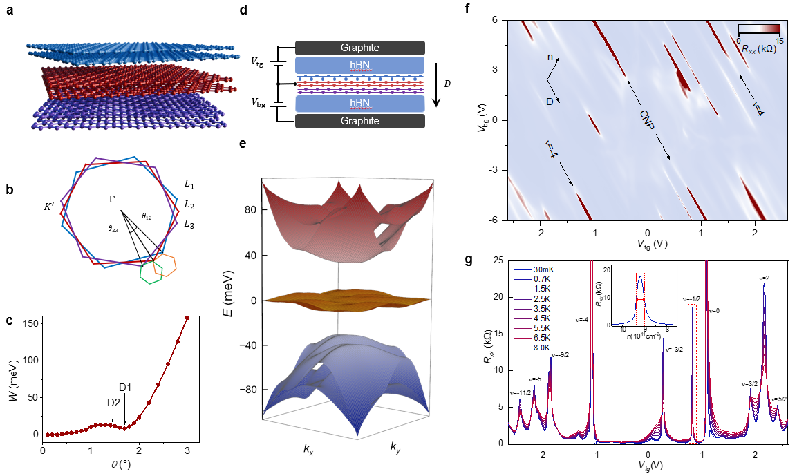 图1(a)顺序三次双层转角石墨烯示意图。(b)布里渊区示意图。(c)平带带宽随角度的变化。(d)器件结构示意图。(e)顺序三次双层转角石墨的能带结构。(f)1.75°器件电阻随顶栅电压和底栅电压的变化。(g)器件电阻在底栅电压为-6V时随顶栅电压的变化。