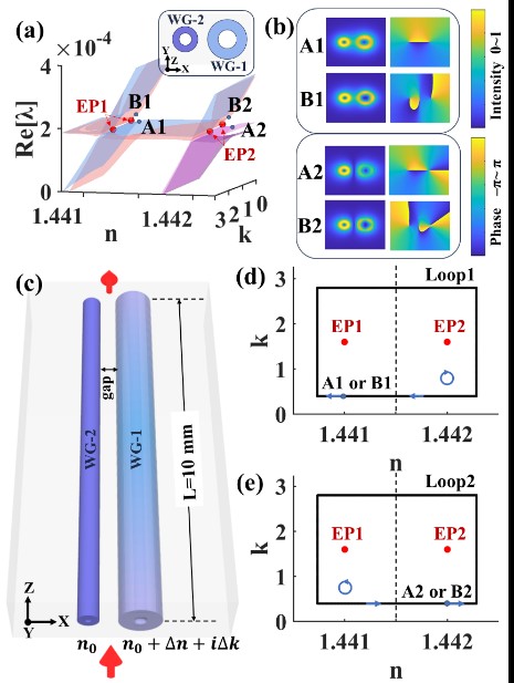 图3 动态环绕不同黎曼面上的奇异点实现光学轨道角动量拓扑荷转换。 (a) 系统的有效模式折射率的实部,折射率的实部和虚部n 和 k 为参数空间。(b) A1、B1、A2、B2 的本征态。(c) 系统的结构示意图。(d)(e) 波导系统的四组环绕路径随着 n 和 k 的变化情况。