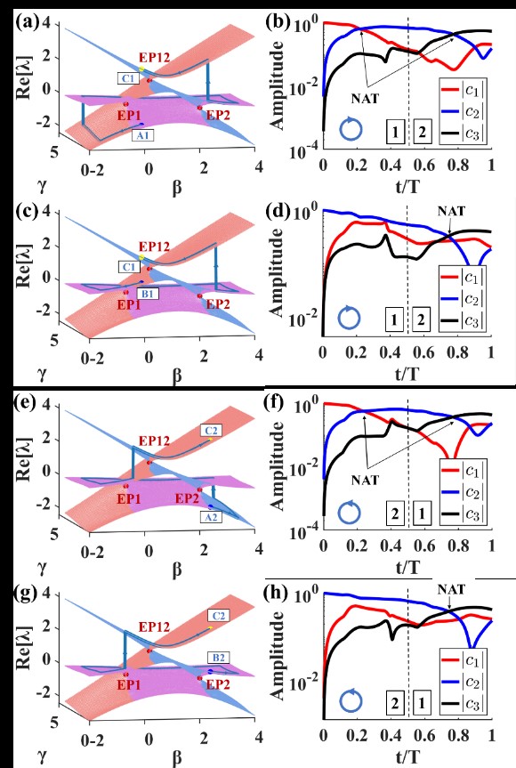 图2 动态环绕不同黎曼面上的奇异点实现光学轨道角动量拓扑荷转换的理论模型。(a)(c)(e)(g) 在黎曼面上以不同环绕方向和初始态绘制的三维演化轨迹(蓝色曲线)。蓝色和黄色点分别表示起始点和终点。(b)(d)(f)(h) 理论计算得到的特征态振幅随时间的演化过程。