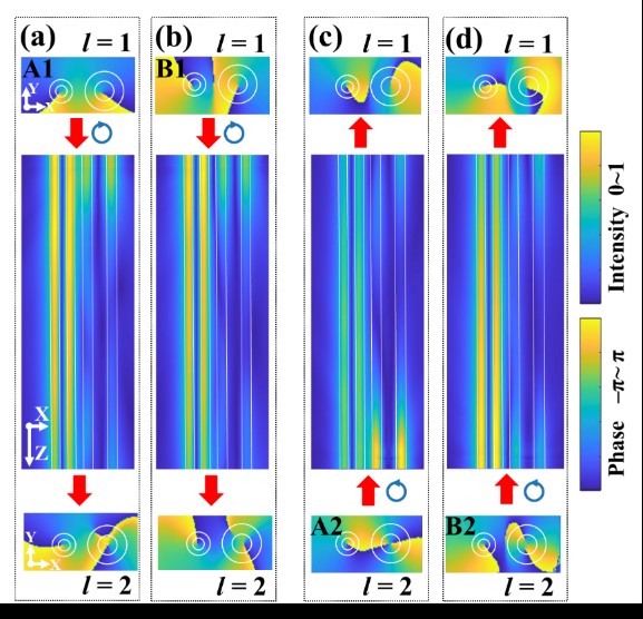 图4 不同环绕方向和初始态下光学轨道角动量拓扑荷转换。(a)顺时针方向,初始态为A1。(b)顺时针方向,初始态为B1。(c)逆时针方向,初始态为A2。(d)逆时针方向,初始态为B2。图中展示了输入和输出态的xy平面相位分布以及传输过程的电场强度分布。