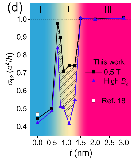 图1:不同耦合强度下的相图。QAH/SC/QAH器件的两端电导σ12在低磁场(0.5T)和高磁场下随氧化铝厚度t的依赖关系。区域I、II和III根据σ12在低磁场和高磁场下的不同响应行为进行划分,其中,高磁场下σ12随外加磁场Bz增加而递减的情况位于区域II(阴影部分),这种递减来自器件中的超导近邻效应受磁场的抑制。Ref.18的数据点来自此前另一研究团队的报道。