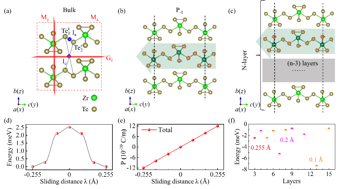 图1:(a)ZrTe5体相的晶体结构;(b)ZrTe5三层滑移相的晶体结构;(c)N层ZrTe5-薄膜中次表面滑移的晶体结构示意;(d)ZrTe5三层铁电翻转的能垒;(e)ZrTe5三层的铁电翻转的面内极化随滑移步长的演化;(f)N层ZrTe5体系滑移次表面的能量变化及对应的最优滑移步长。