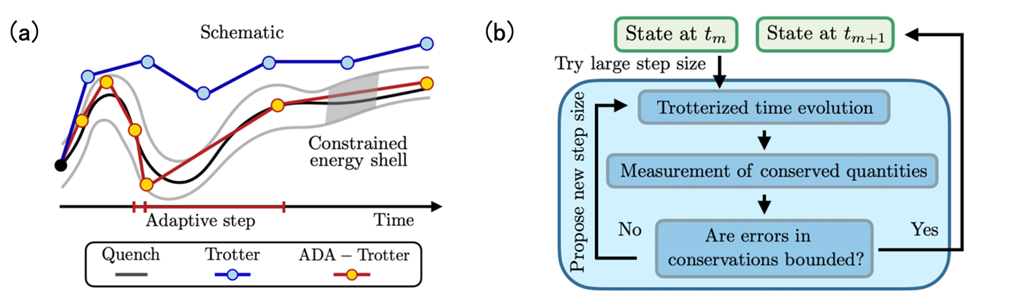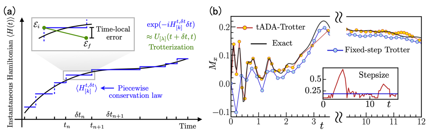 图2:(a)tADA-Trotter的示意图。将哈密顿量的时间变化离散化,利用分段守恒定律调整Trotter演化步长。(b)自适应算法与固定步长算法的对比。