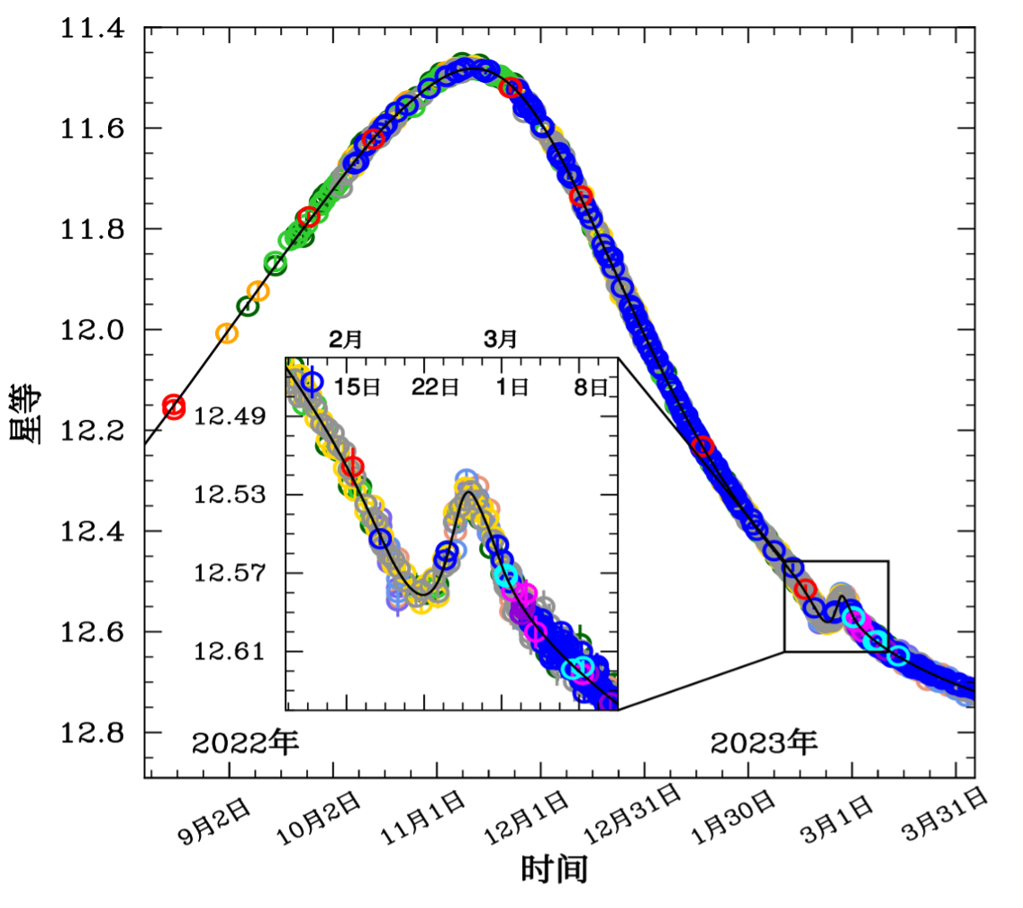 吴泽炫介绍说,“我们尝试对Gaia22dkv几次VLTI的观测,但由于较差的天气条件等因素都没有成功。我们当时对它已经不抱太大希望了,也减少了观测的频度。不过我们仍然坚持对数据进行实时分析和监测,在2023年3月初,注意到光变曲线与单透镜模型有约4%的偏离。”
