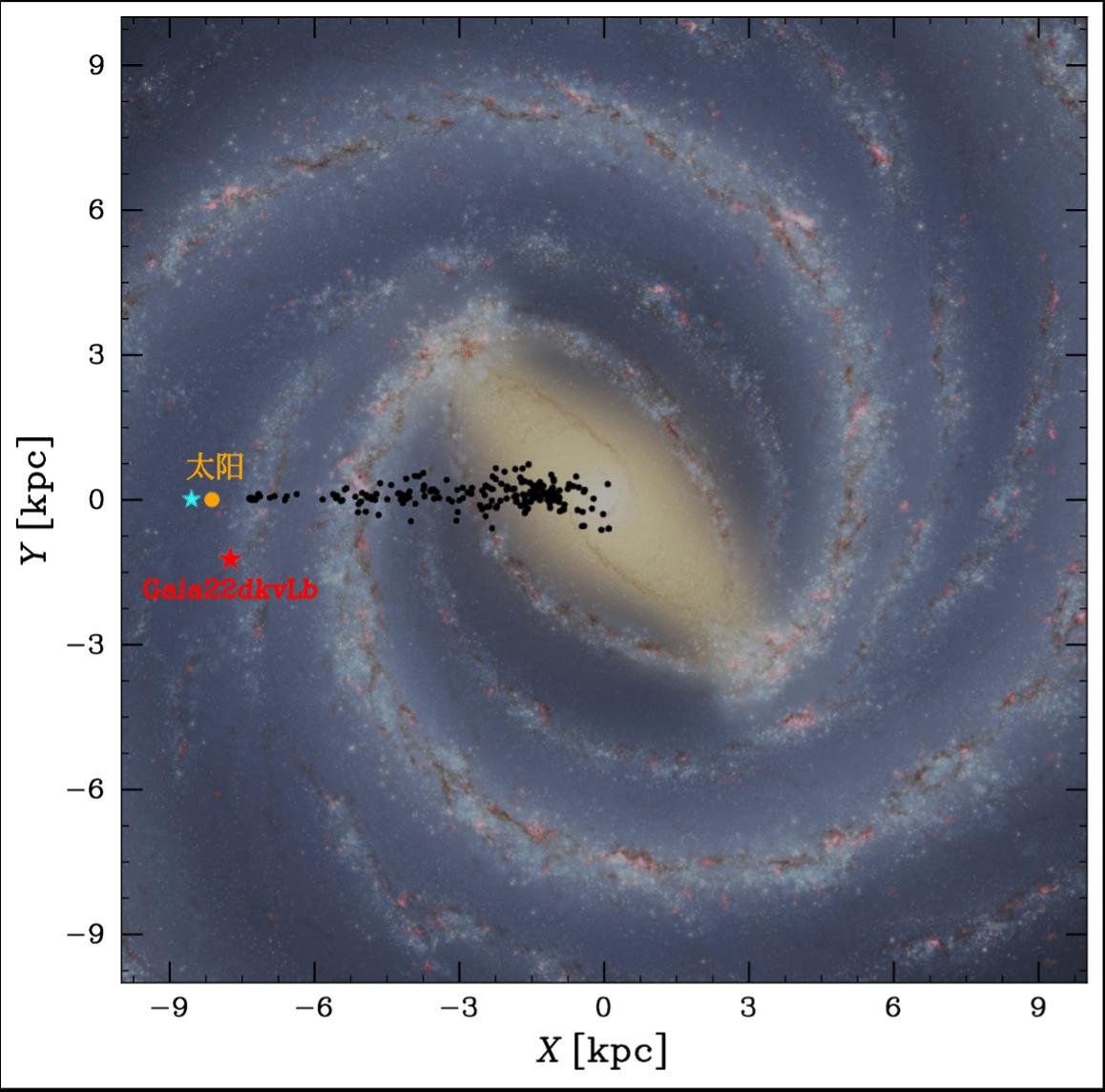 图2:系外行星Gaia22dkvLb在银河系中的位置(红色)。黑色点表示目前通过微引力透镜法发现的系外行星,均大多数在核球方向;浅蓝色点为另一颗非核球天区的微引力透镜行星Kojima1-Lb。俯视银河系的艺术想象图来自NASA/JPL-Caltech/R.Hurt(SSC/Caltech)。