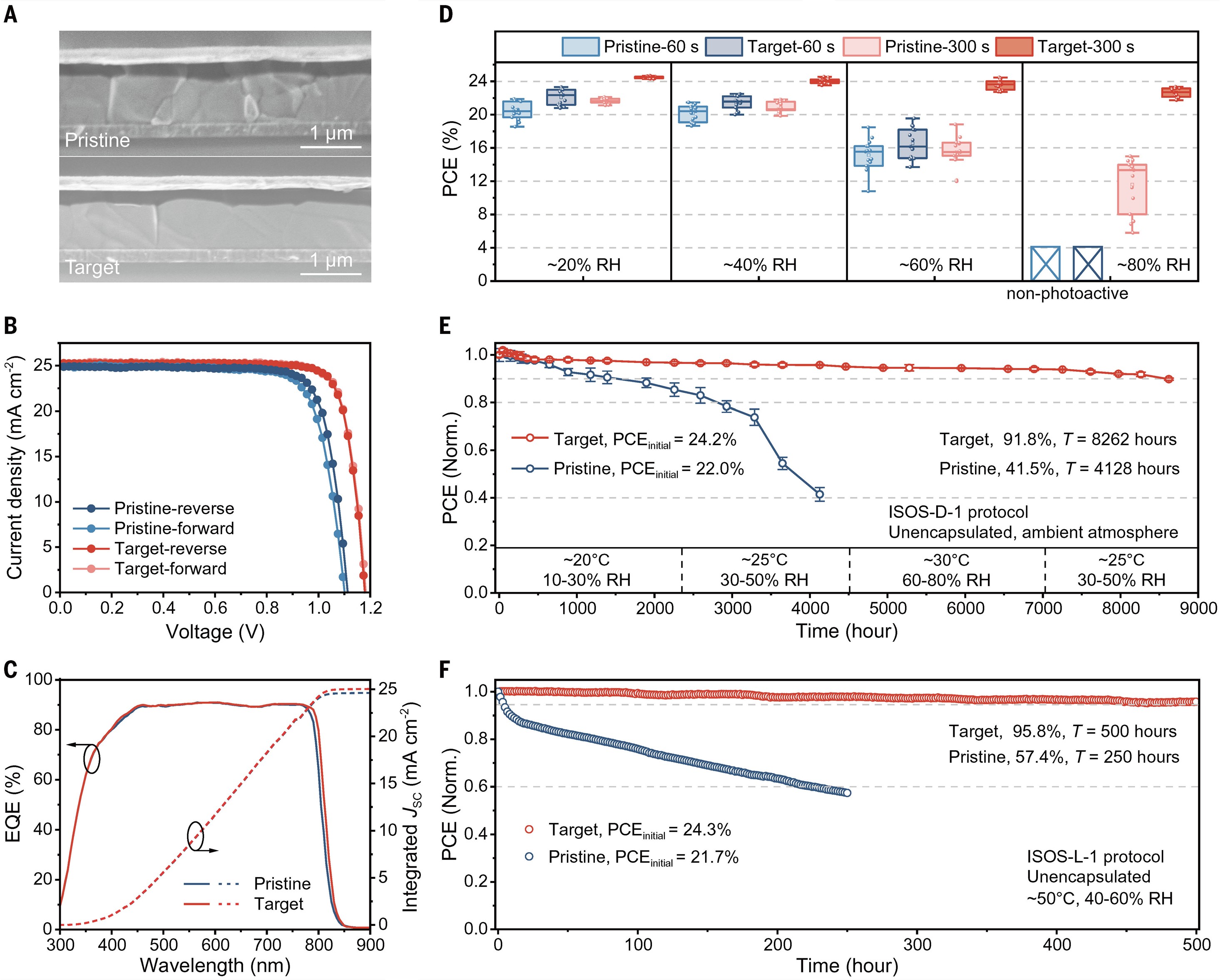 研究团队还发现,高湿度环境下器件的光伏性能及器件制备的可重复性大幅提升。在20-60% RH环境湿度下,稳定制备出能量转换效率超过24.5%的光伏器件;当湿度高达80% RH时,也可稳定制备出效率超过23.5%的光伏器件。研究团队还首次报道了高湿度环境下制备的光伏器件在加速老化(ISOS-L-2I标准)条件下的工作稳定性,得益于钙钛矿高质量的膜层和相稳定性,该工作中制备的光伏器件在存储、光照、加热等条件下均展现出优异的工作稳定性(图2)。此外,在不同制备方法、器件面积及结构、钙钛矿组份及衍生物添加剂种类等实验条件下,原位构建晶体覆盖层实验策略具有广泛的普适性。因此,研究团队提出的原位构建晶体覆盖层策略是解决高湿度环境下制备高效、稳定光伏器件的有效途径,这将有力推动钙钛矿光伏器件的实际应用与产业化进程。