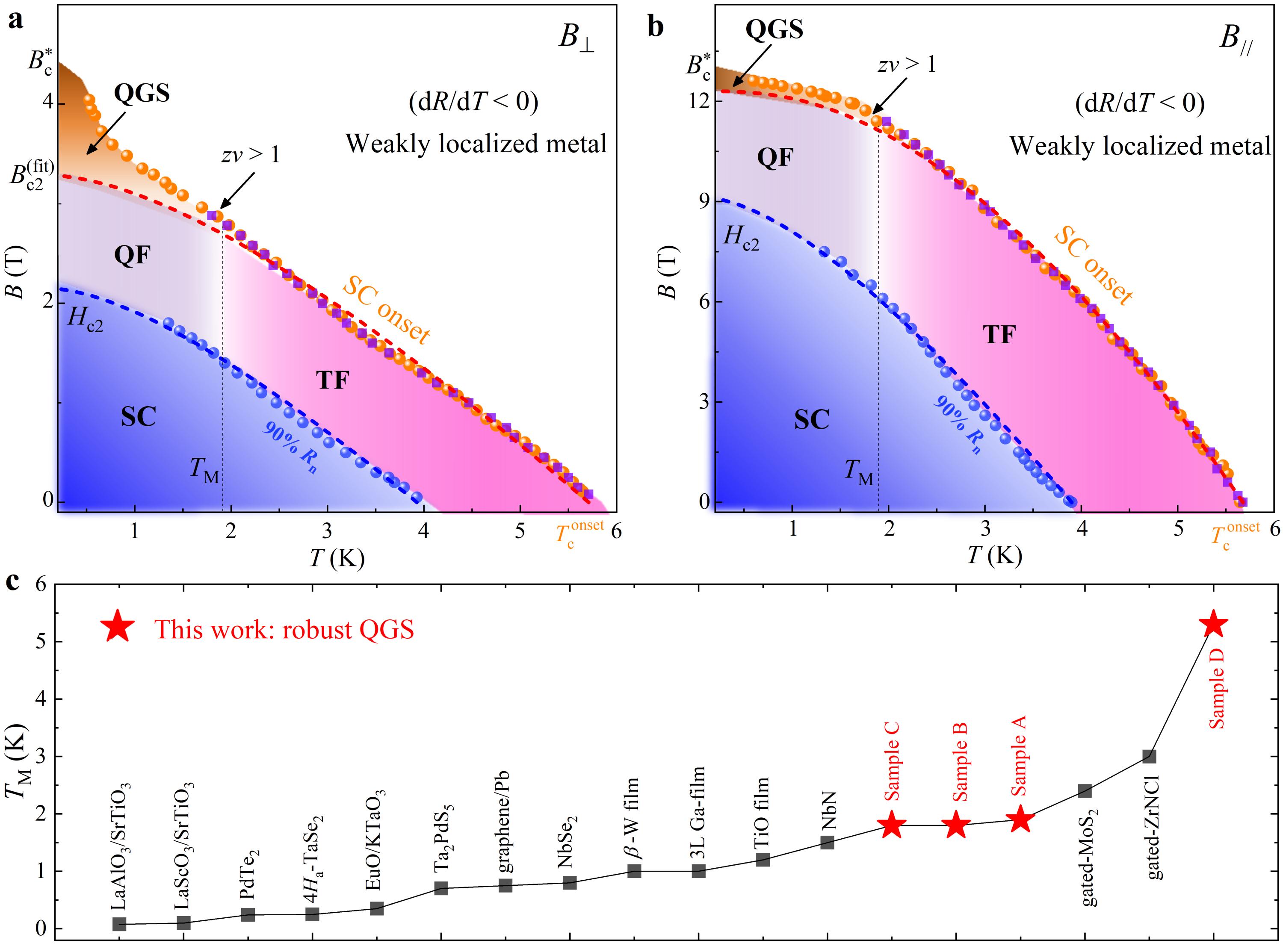 图2三维各向异性量子格里菲斯奇异性B–T相图。a.垂直磁场下量子格里菲斯奇异性的磁场-温度相图。相图中“SC”(蓝色区域)表示超导区,“TF”(分红色区域)表示热涨落区,“QF”(紫色区域)表示量子涨落区,“QGS”(棕黄色区域)表示量子格里菲斯奇异性区,白色区域表示弱局域化金属区。在低温强磁场下(量子格里菲斯奇异性区),发生超导-金属相变的临界磁场随着温度的下降,发生明显上翘。b.平行磁场下量子格里菲斯奇异性的磁场-温度相图。在低温强磁场下(量子格里菲斯奇异性区),发生超导-金属相变的临界磁场随着温度的下降,明显趋向于饱和。表现出各向异性三维的特征。c.总结了文献中报道的不同材料体系发生量子格里菲斯奇异性奇异性的特征温度,图中红色五角星代表本文数据。