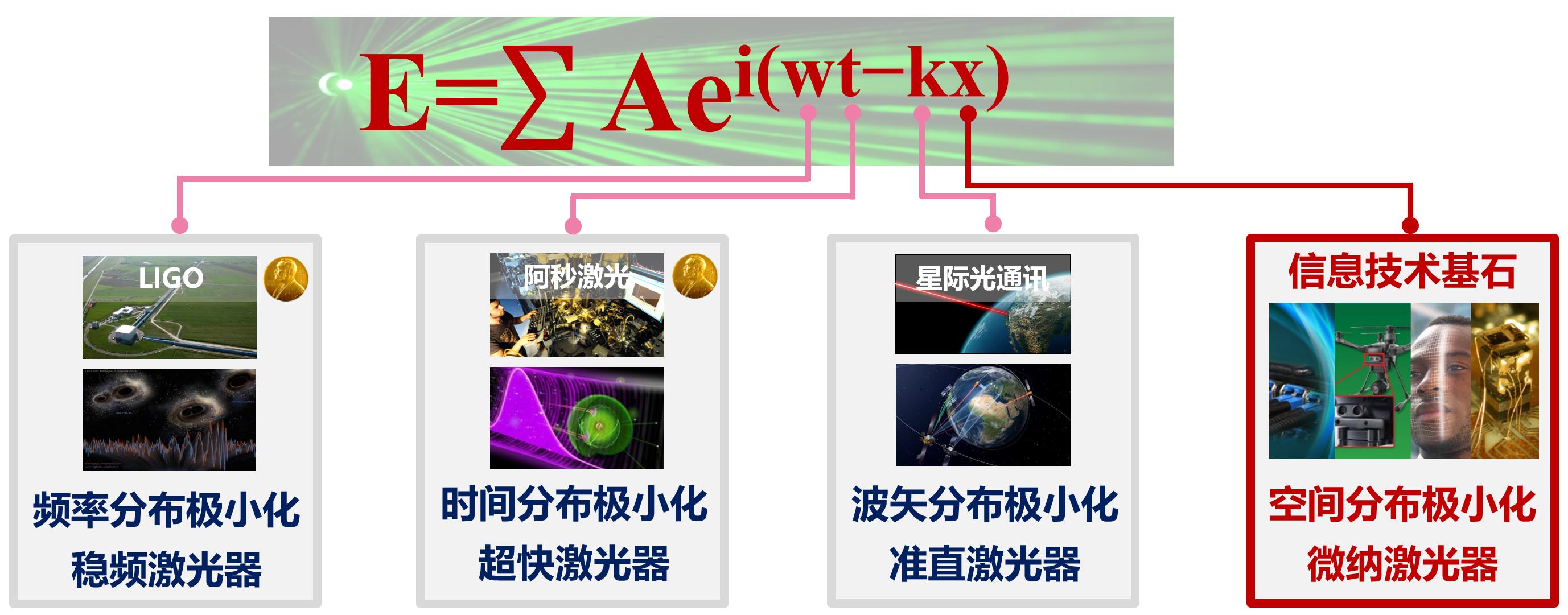 自1960年激光问世以来,通过在频率、时间、动量或空间等维度对光场进行局域化,从而实现更高性能的激光一直是推动激光物理与器件发展的核心驱动力,由此催生出的新型高性能激光也深刻促进了现代科学与技术的进步(图2)。例如,在频率维度极端局域化光场可以得到用来构建精密干涉装置所需的频率稳定激光,使引力波探测成为可能(2017年诺贝尔物理学奖);在时间维度极端局域化光场可以得到超快的阿秒激光(2023年诺贝尔物理学奖),为观测微观世界中粒子的超快运动提供了可能;在波矢维度极端局域化光场可获得超准直激光,可应用于远距离星际空间高速光通信;而在空间维度上,极端局域化光场可获得纳米尺度激光,有望为新一代信息技术和研究强光场局域下的光与物质相互作用带来新的机遇。