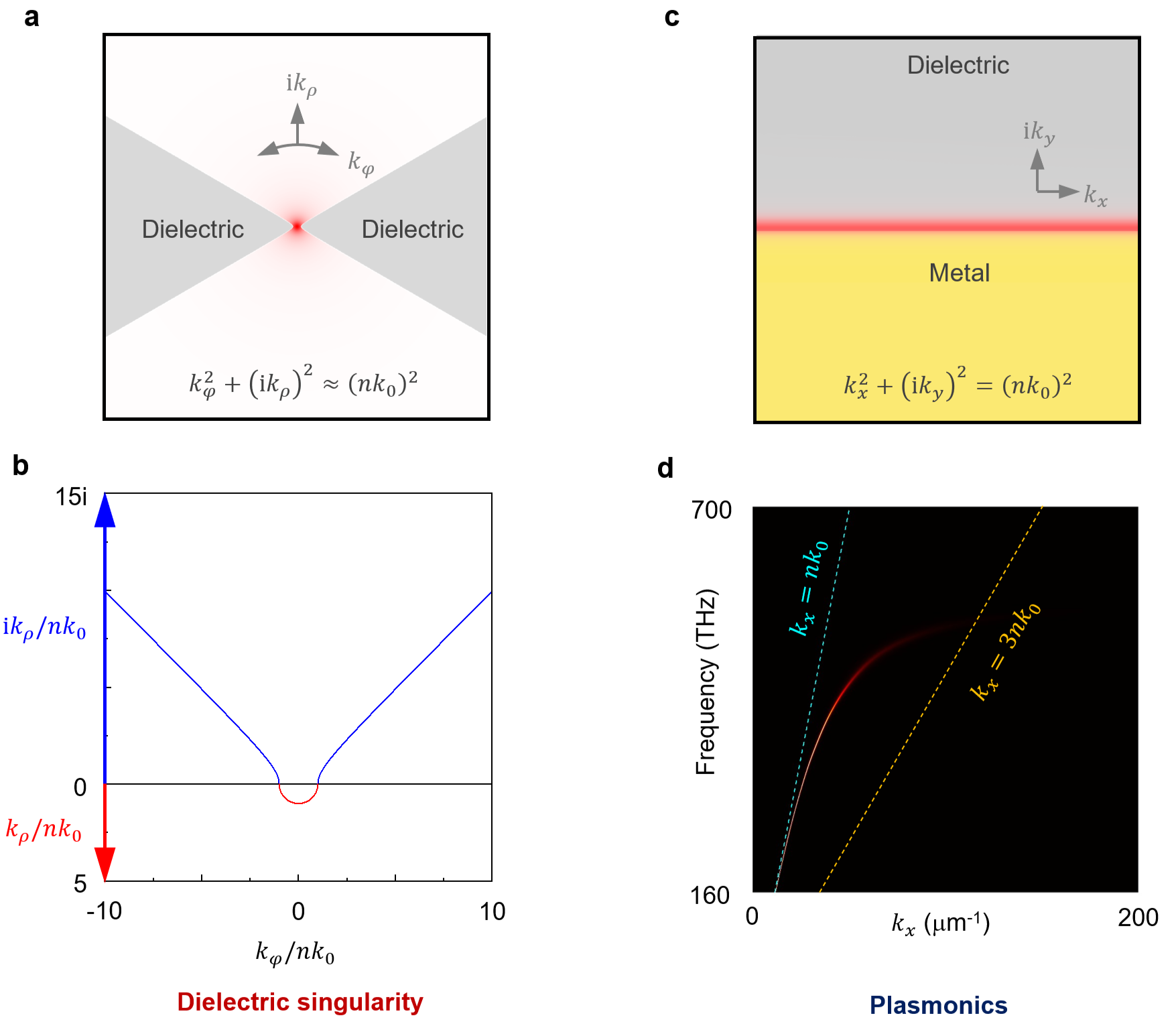 马仁敏课题组基于麦克斯韦方程构建了介电质体系突破光学衍射极限的理论,发现介电蝶形纳米天线顶点处的电场奇点源自动量的发散:在顶点附近,奇点的角向动量是实数,而径向动量是虚数,在靠近顶点处,这两个动量的绝对值发散,但是由这两个动量组成的总动量仍保持一个由材料介电常数决定的有限小值(图3)。该机制类似于等离激元模式的光场限制机制(在等离激元效应中,其为虚数的横向动量使得为实数的纵向动量增大),但确没有欧姆损耗。介电质体系中的电场奇点可以实现光场的极端压缩,光场的半高宽可远小于1纳米。