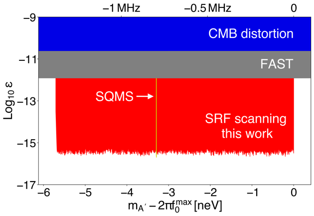 由于暗物质质量区间未知,对暗光子暗物质的搜寻除了需要极高灵敏度外,还需要快速覆盖不同的质量区间。山河合作组利用图1所示的2K液氦环境中的超导射频腔,首次在超导腔体上使用机械调谐器,在短时间内进行了1150次扫描。在初始频率接近1.299 GHz的情况下,覆盖了1.37 MHz的频率范围。研究团队还设计了世界上第一个适用于极高品质因子的数据处理方法,对扫描范围内的暗光子暗物质进行了严格的排除。该实验排除的参数空间,如图2所示。