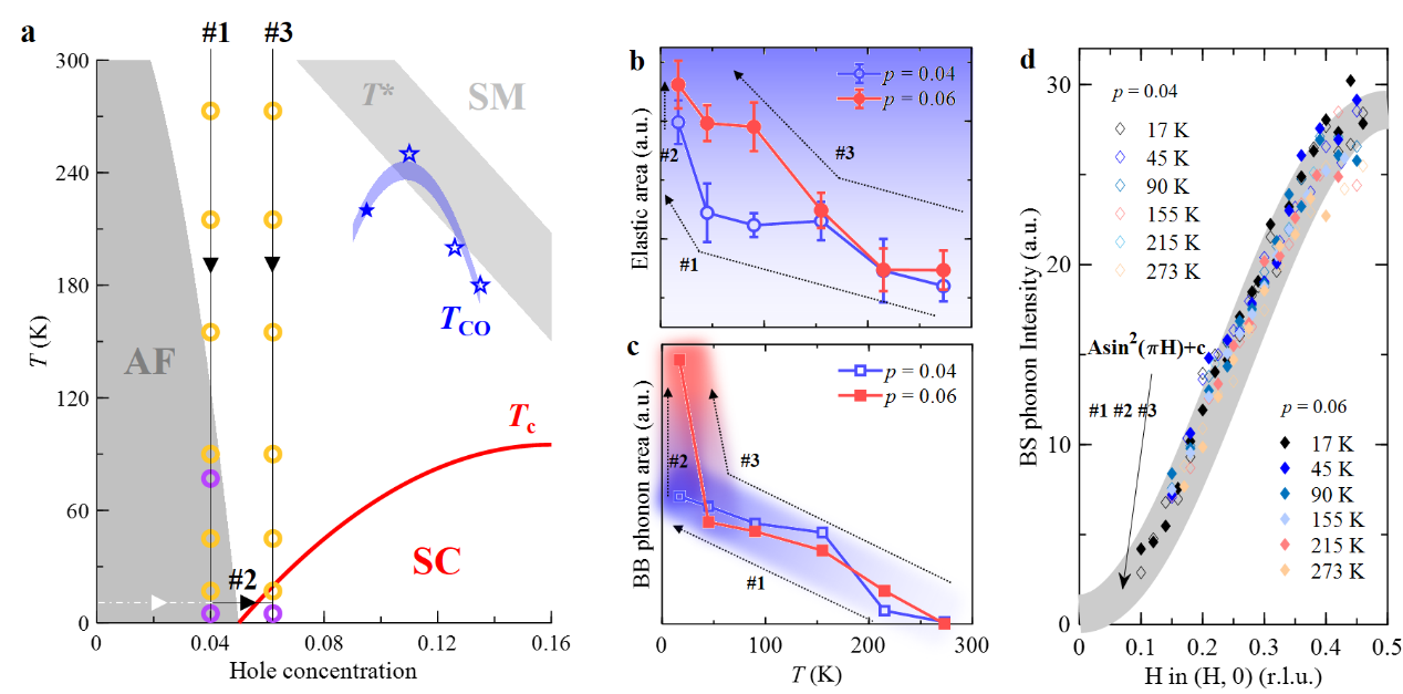 图1.(a)实验相图研究区间。(b)电荷序随温度演化。(c)bond-buckling phonon强度随温度演化。(d)bond-stretching phonon强度随温度演化。