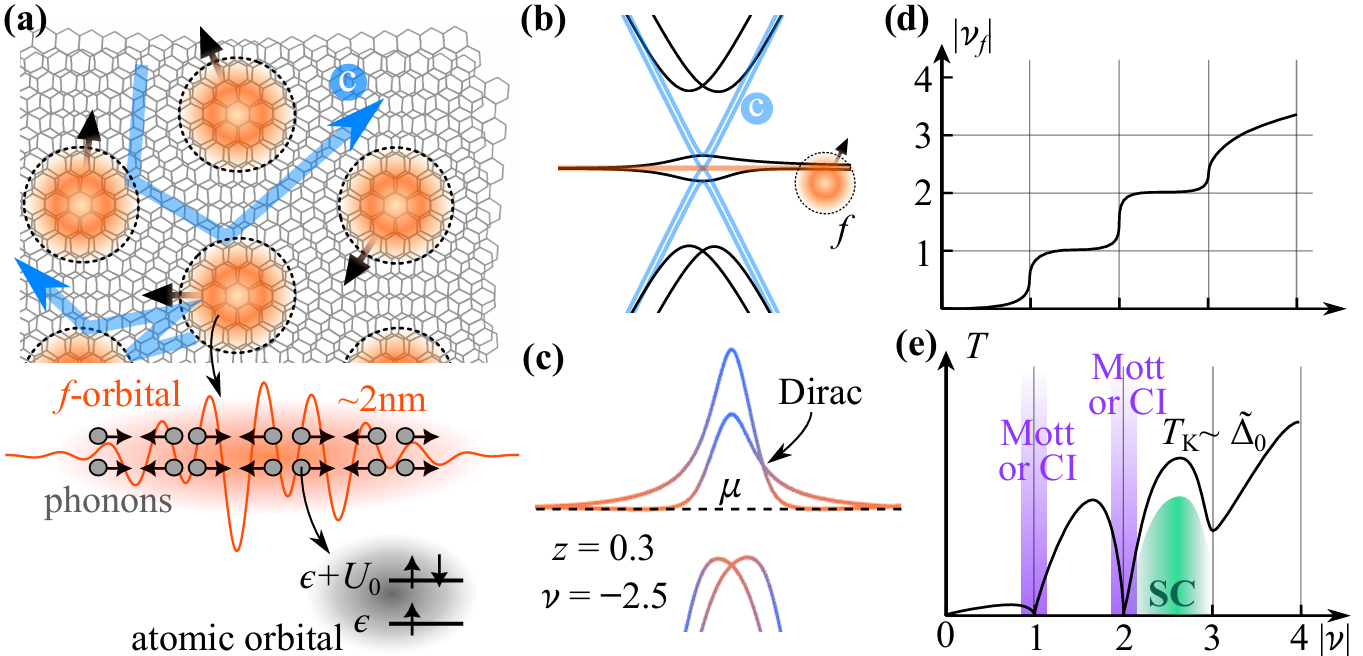 图1.魔角石墨烯作为重费米子问题。(a)中橙色包络示意f-电子轨道。声子振动导致反洪特耦合。(b,c)无关联和强关联的重费米子能带。(d,e)f电子占据数与近藤温度随掺杂的变化示意。超导序一般出现在|v|=2.5附近的穹顶状区域中。
