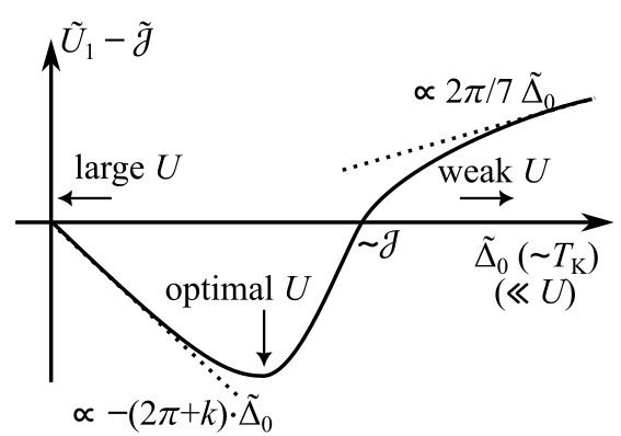 图2.有效配对势作为近藤温度TK的函数,其中J是反洪特耦合。当TK远大于J时,有效相互作用是排斥的。当TK大约降低至J时,有效相互作用变为吸引。当TK趋于零时,配对势也趋于零。
