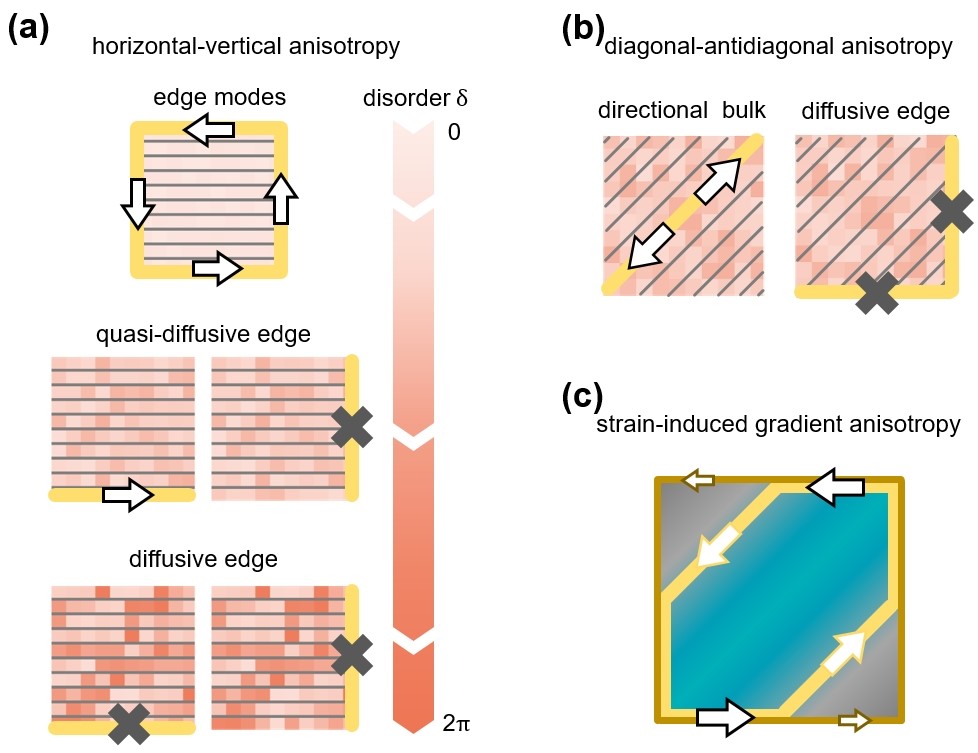 图 2新奇的各向异性拓扑输运现象。(a)横纵各向异性拓扑绝缘体中出现的准扩散相。(b)对角-反对角各向异性拓扑绝缘体中,体态相比边界态表现出更强的稳健性。(c)在拉伸引起的梯度各向异性下,沿不同输运路径的边界态有不同的稳健性。