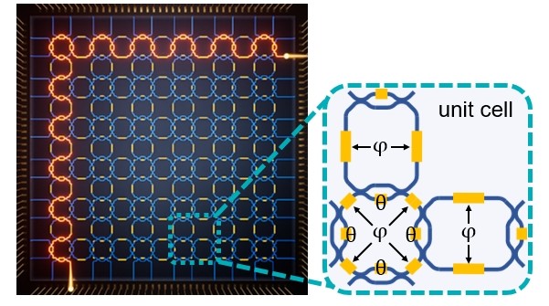 图 1可编程拓扑光子芯片结构示意图。右侧是晶体的元胞,蓝色为光波导,黄色为热调电极。
