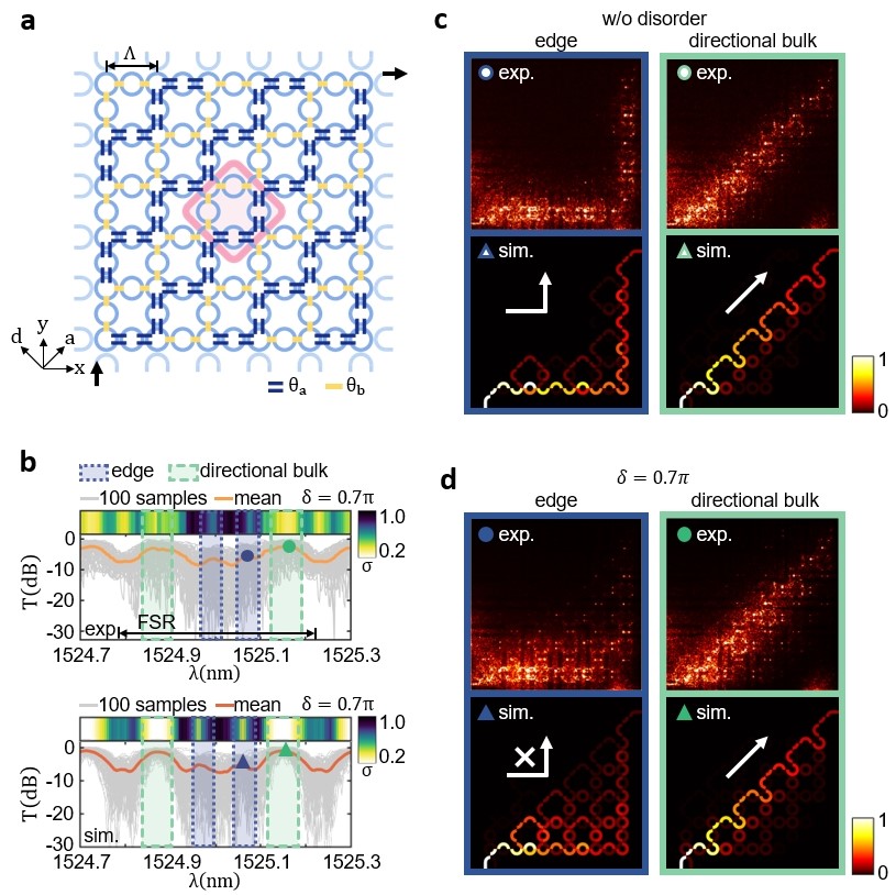 图 3 体态输运的更强稳健性。(a)对角-反对角各向异性拓扑绝缘体。(b)扰动下的输运谱,显示体态(绿色)相比边界态(蓝色)有更强的稳健性。(c,d)无扰动(c)和扰动(d)条件下的边界态和体态的实空间光场分布。边界态在扰动下被破坏,而方向性的体态变化很小。