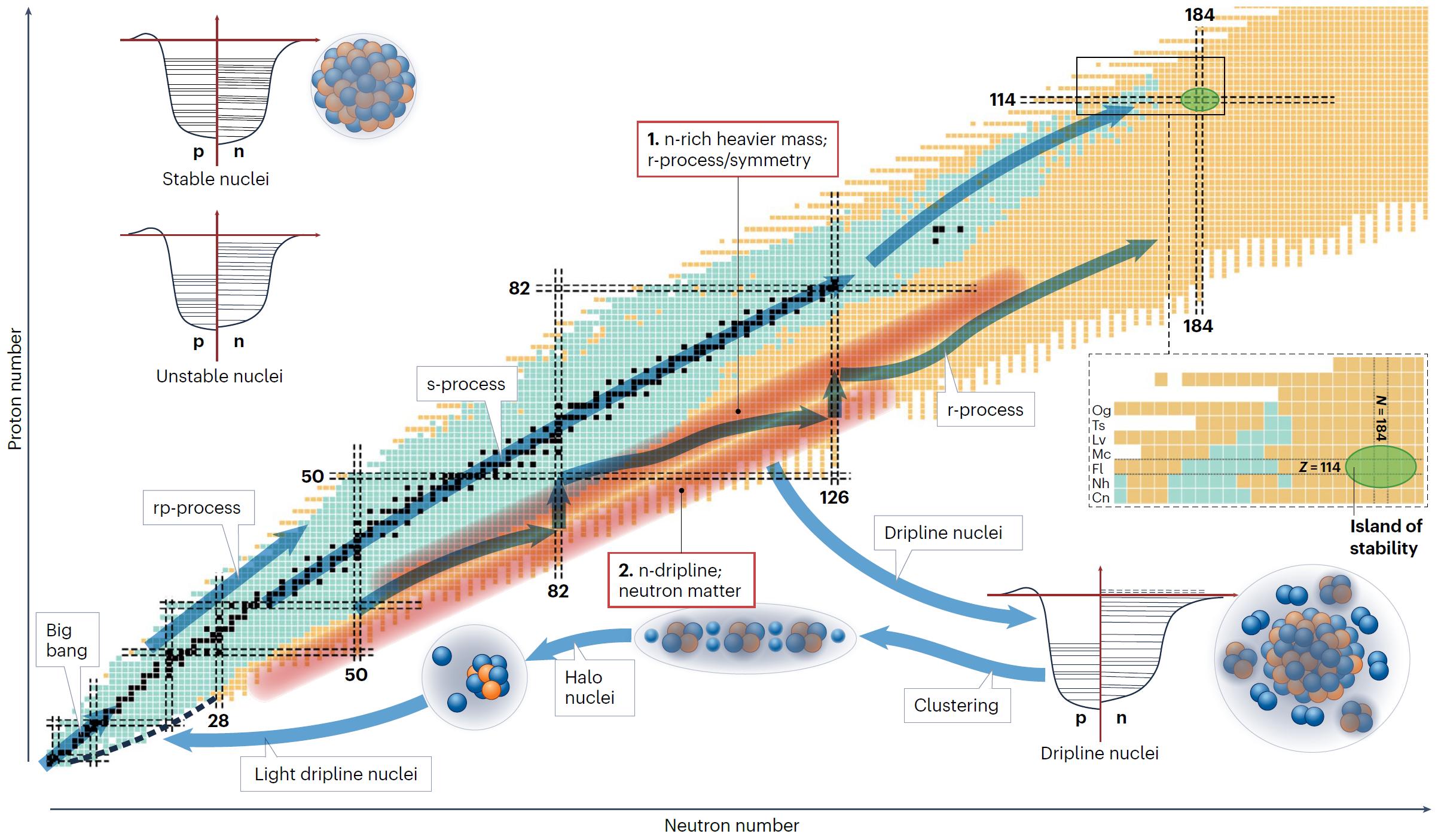 原子核版图与若干特征结构和过程:自然界存在的稳定和长寿命核(小黑方块);人工产生并实验观察到的不稳定核(蓝色区域);理论预言的不稳定核(黄色区域);右侧小图里的绿色椭圆区表示壳模型预言的超重核“稳定岛”;粗箭头表示元素生成的主要核天体过程;各区域发现的核结构特征用相应的小图展示;两条红色带子是对未来的展望(见下文表述)。图中p为质子,n为中子,s-process为慢中子俘获过程,rp-process为快质子俘获过程,而r-process为快中子俘获过程。