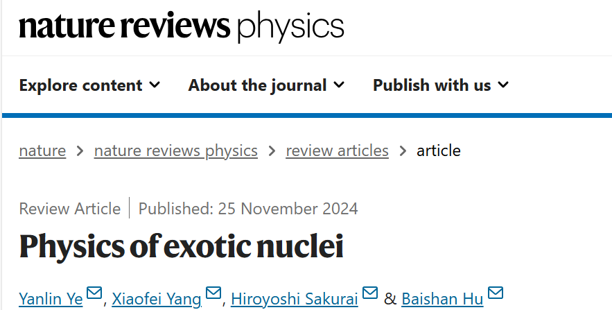 三十年多年来,不稳定核物理领域快速发展,其中各分支已有相当数量的综述文章,但尚缺少全领域比较完整的综述。为此,具有广泛影响的《自然综述·物理》杂志邀请叶沿林和杨晓菲牵头撰写和发表了奇特原子核物理领域的系统性回顾和展望。该文章内容分为引言、核力与理论模型、壳结构及其在奇特核区的演化、质子和中子滴线区物理、原子核中的集团结构和展望。作者阐述了以下要点: