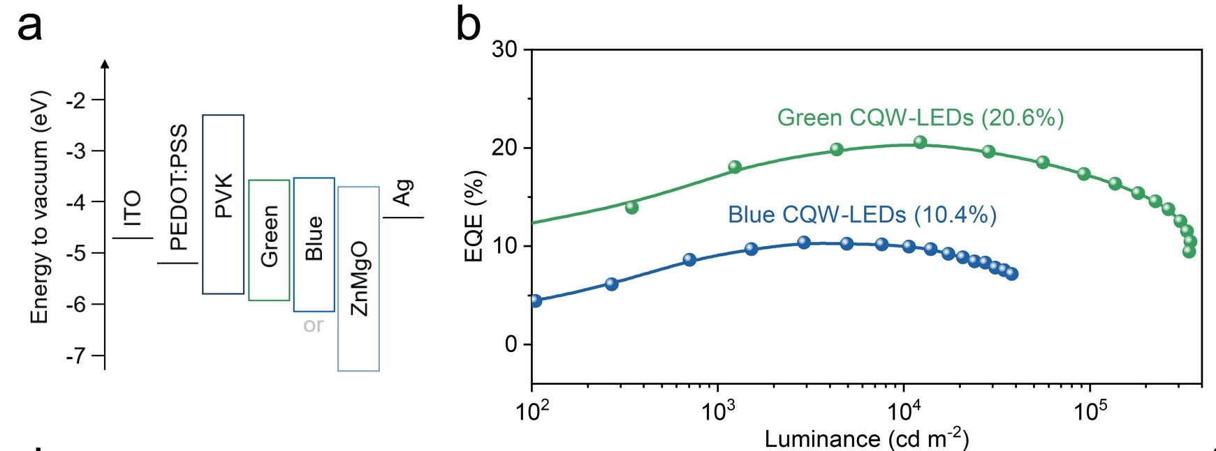 研究团队考虑到异质结构对于纳米晶表面缺陷的钝化作用,通过热注入壳层生长方法在硒锌镉核外侧外延生长硫化锌保护层。这种方法有效地提升了纳米晶的发光效率与提纯稳定性,为后续的器件制备提供了优良的发光材料。值得一提的是,该策略有效解决了长期困扰胶体量子阱领域有关发光波长过度红移的问题,在蓝光区与绿光区均实现了优秀的发光性能。