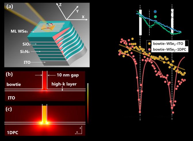 图1. (a)器件结构示意图。bowtie结构在(b)ITO衬底和 (c)1DPC上的模场分布。(d)BSW对纳腔模式体积的压缩