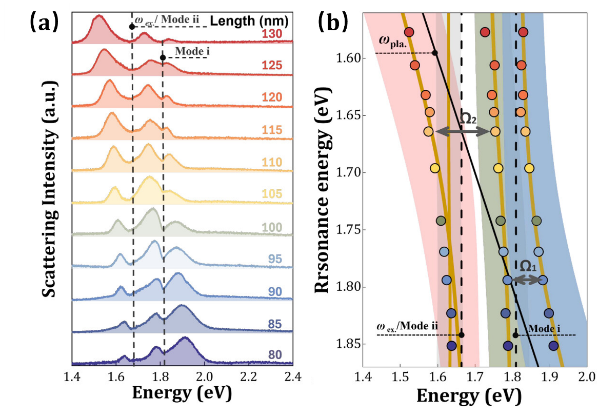 图3 (a)暗场散射光谱,从下至上分代表bowtie纳米结构的尺寸从80 nm到130 nm。(b)极化激元色散与等离激元能量的函数关系,Ω2处实现了186meV的拉比劈裂。
