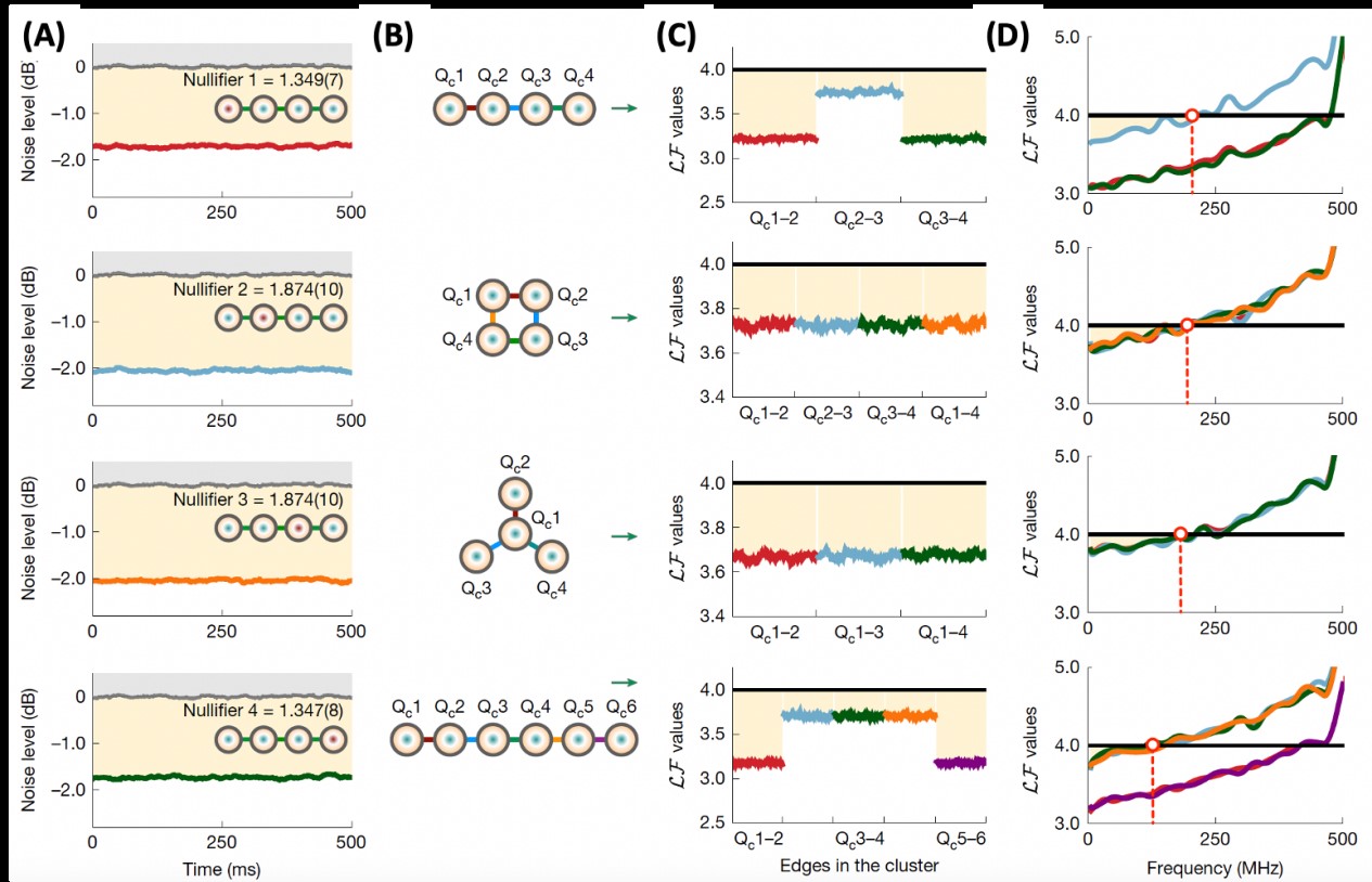 图2. 不同纠缠结构的连续变量簇态实验结果:(A)Nullifier;(B) 不同纠缠结构簇态;(C)van Loock-Furusawa判据实验结果;(D)100MHz宽带纠缠判定。