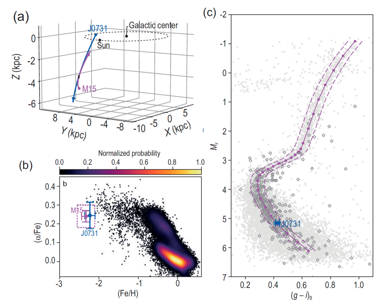 图2:J0731+3717与M15的轨道关联(a)、化学关联(b)与年龄关联(c)。