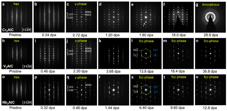 图1. 800 keV Kr2+原位辐照下Cr₂AlC (a-g)、V₂AlC (h-n)、Nb₂AlC (o-u)三种MAX相中不同的多级相变路径
