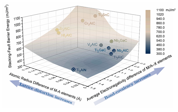 图2.不同MAX相(γ中间相)堆垛层错能垒与其原子半径差值、电负性差值两个指标的关联规律