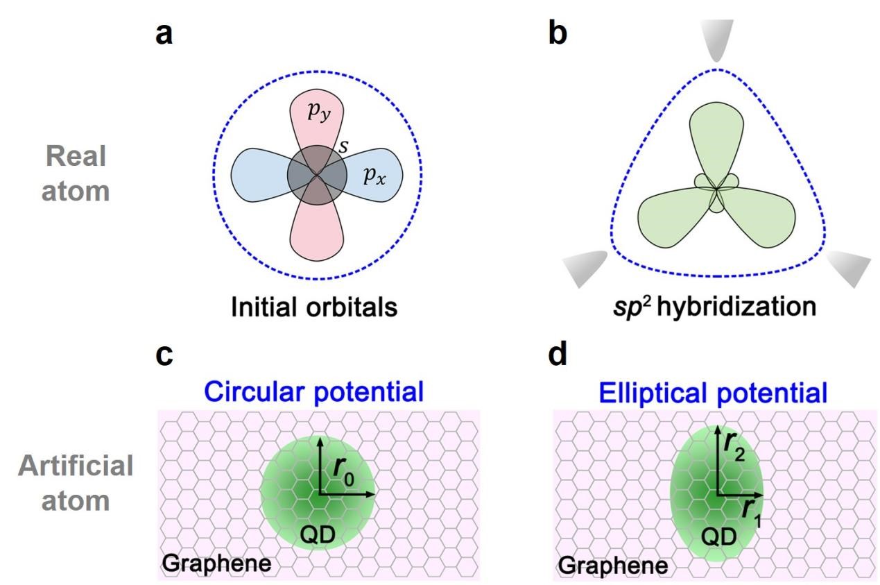 图1.上半部分:真实原子中的(a)未杂化的轨道和(b)sp2轨道杂化示意图。下半部分:人造原子中的(c)圆形势场和(d)椭圆形势场示意图。